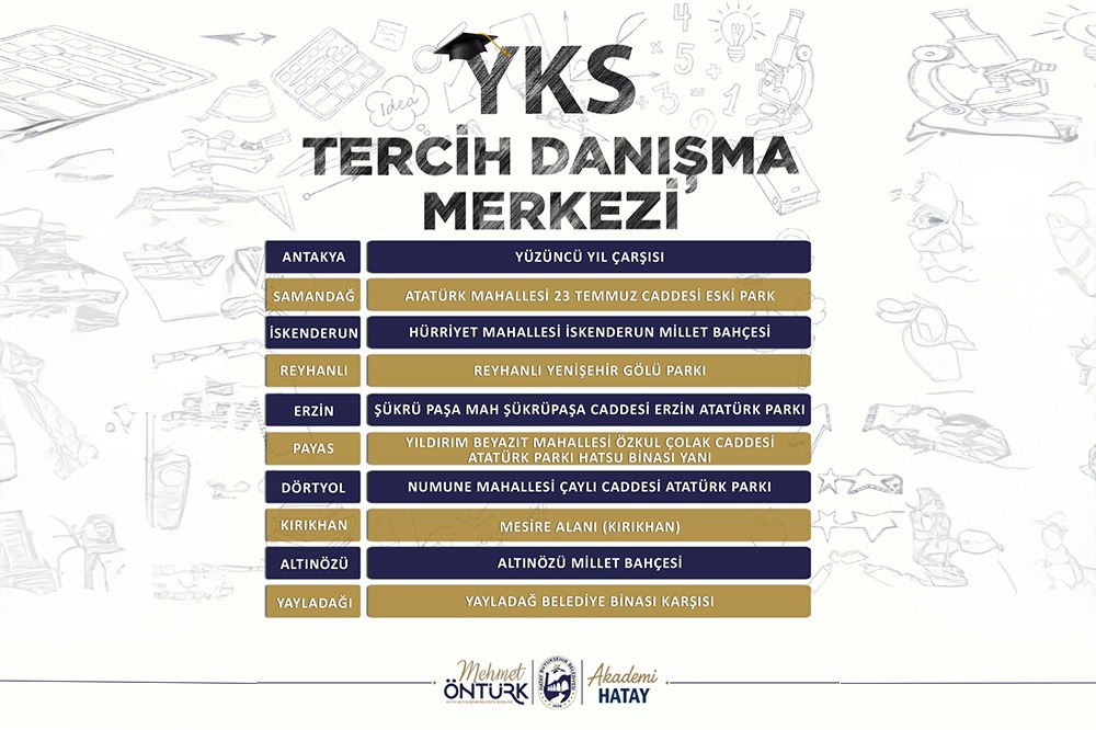 Tercih Danışmanlık Merkezi’nden öğrenciler; Antakya, Altınözü, Dörtyol, Erzin, İskenderun, Payas, Reyhanlı, Samandağ ve Yayladağı ilçelerinde 10:00-16:00 arasında faydalanabilecek.