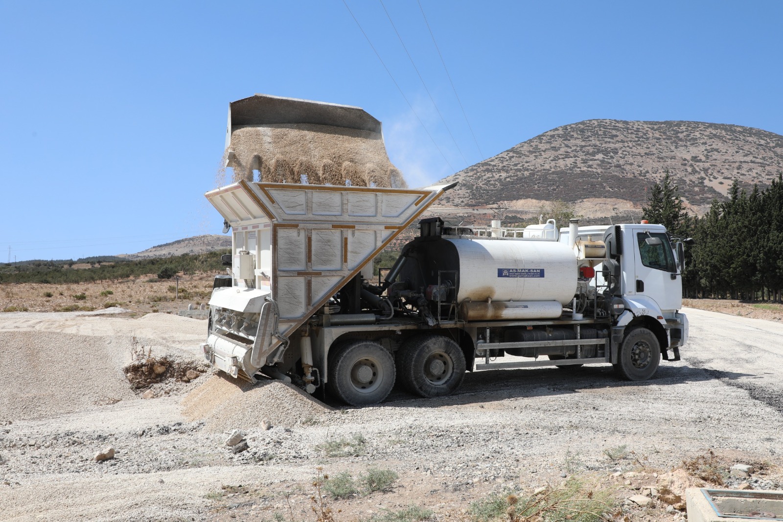 Hatay Büyükşehir Belediyesi, çakıl serimi ve bitüm sızdırma işlevlerini tek bir çatı altında birleştiren kombi sathi kaplama aracıyla 7 kilometre yol yaptı.