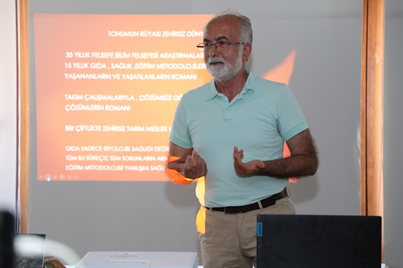 Yazar Çiftçi; zehirsiz tarım, ata tohumu, bilim felsefesi eğitimi gibi ana başlıklarda verdiği konferansta, kadim tarım bilgileriyle bilimi sentezlemenin önemine değindi.