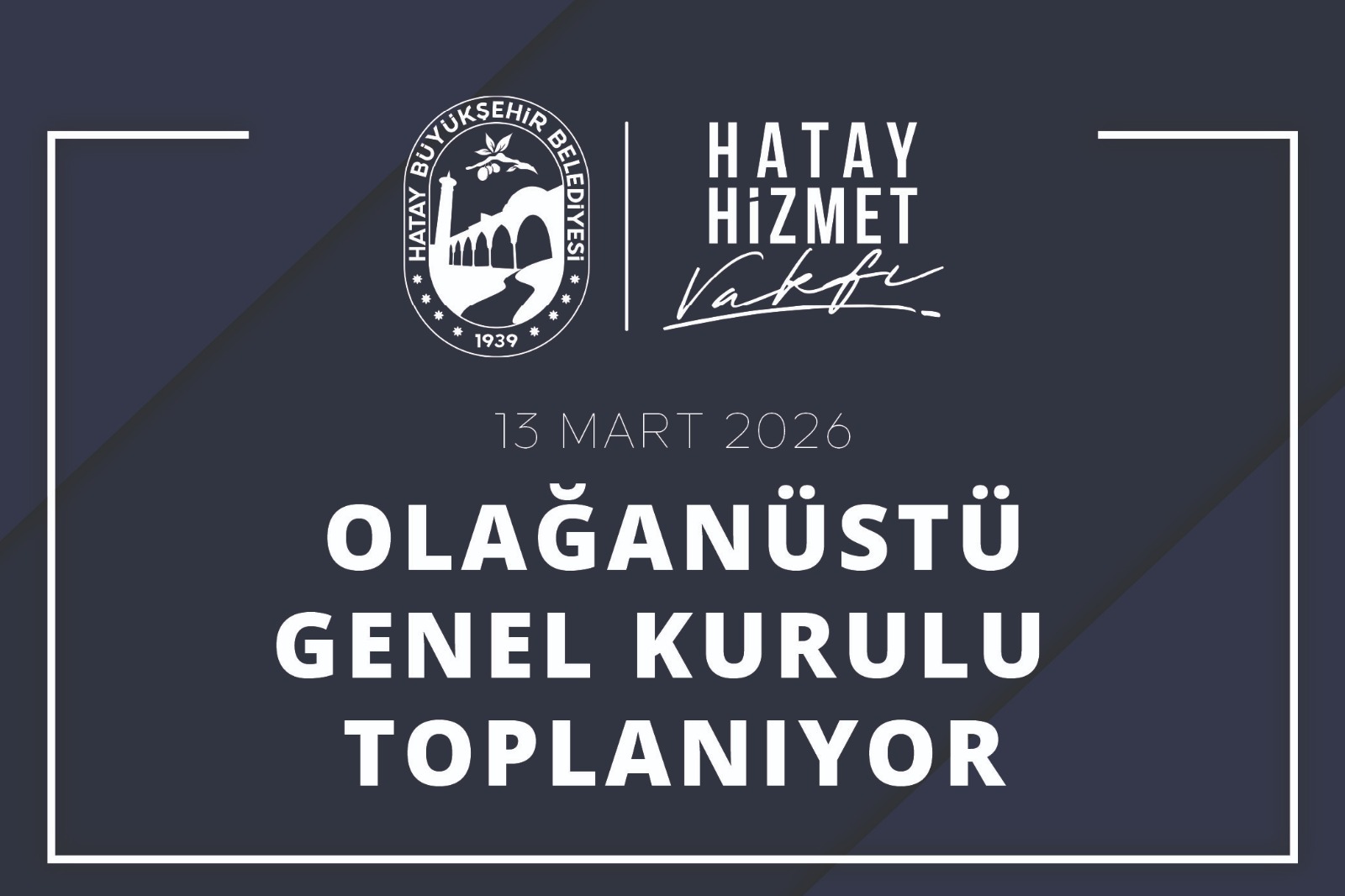 Hatay Hizmet Vakfı, kuruluş senedinin 8’inci maddesinin 2. fıkrası uyarınca Olağanüstü Genel Kurul Toplantısı’nın 13 Mart’ta yapılacağını duyurdu.