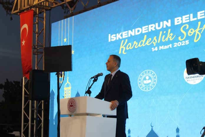 TBMM üyesi YAYMAN’ın Bakanın teşrif edeceği sözüyle birlikte İçişleri Bakanı YERLİKAYA, iftar açıldıktan hemen sonra sahnede yerini aldı. Cumhurbaşkanı Recep Tayyip ERDOĞAN’ın deprem sonrası çalışmalarında İskenderun’a verilen değeri anlatan Bakan YERLİKAYA: