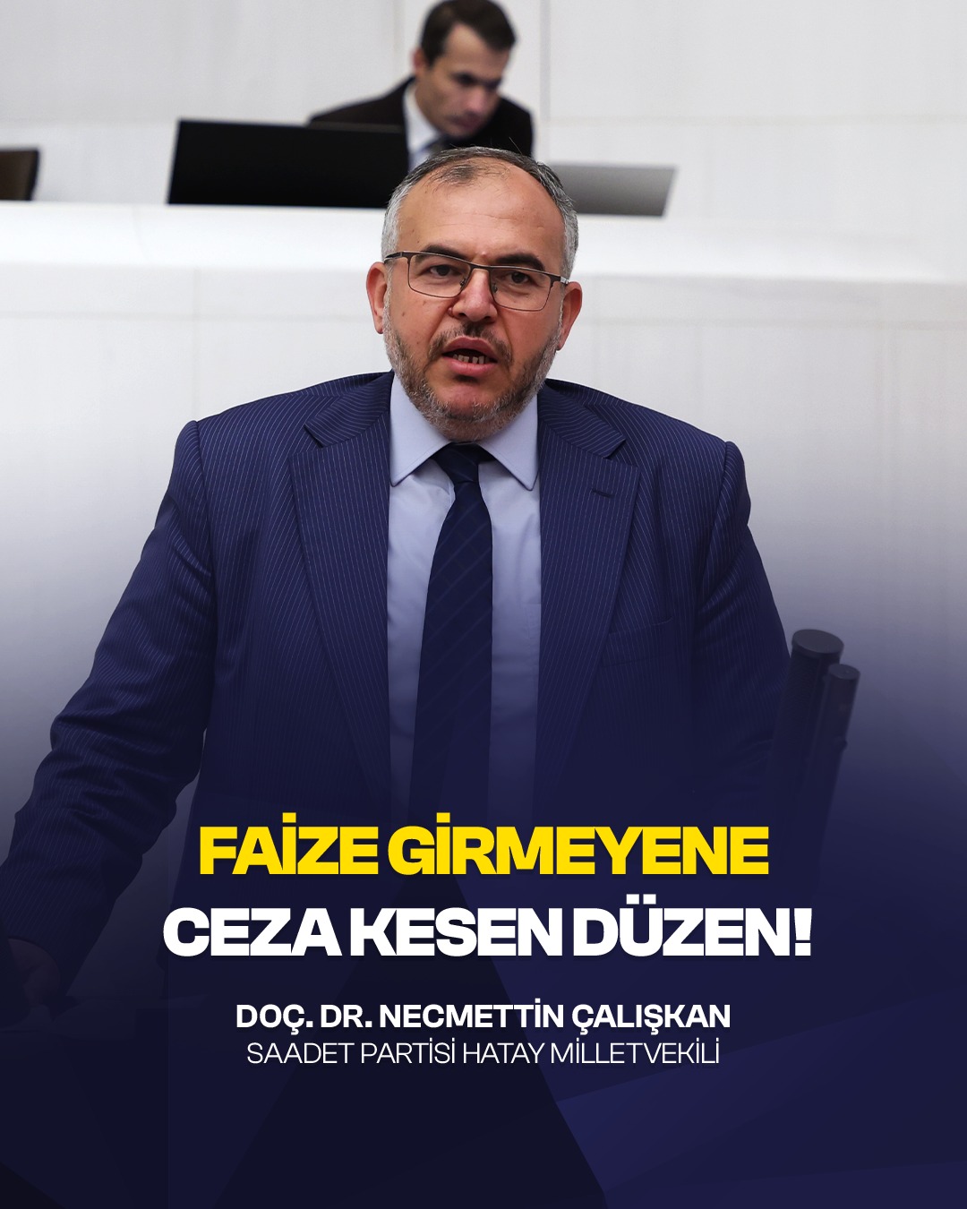 Saadet Partisi Hatay Milletvekili Doç. Dr. Necmettin Çalışkan, TBMM Genel Kurulu’nda yaptığı konuşmada uygulanan vergi ve ceza politikalarının vatandaşı faize zorladığını belirterek, “Faize girmeyene ceza kesiliyor. Devlet, vatandaşı zorla faize bulaştırıyor.” dedi.