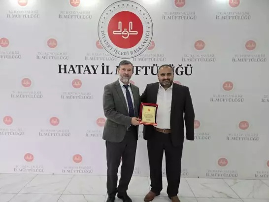 Hatay’da depremde yıkılan caminin yeniden onarımı için katkısından dolayı engelli imam Mehmet Güven’e (42) teşekkür plaketi verildi.