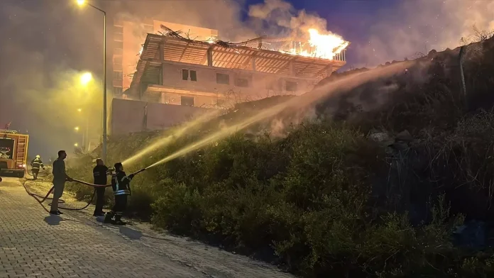 İnşaat halindeki binanın ahşap kalıp malzemelerinin bulunduğu dördüncü katında henüz belirlenemeyen bir nedenle çıkan yangın, kısa sürede binanın çevresindeki otluk alana da sıçradı.
