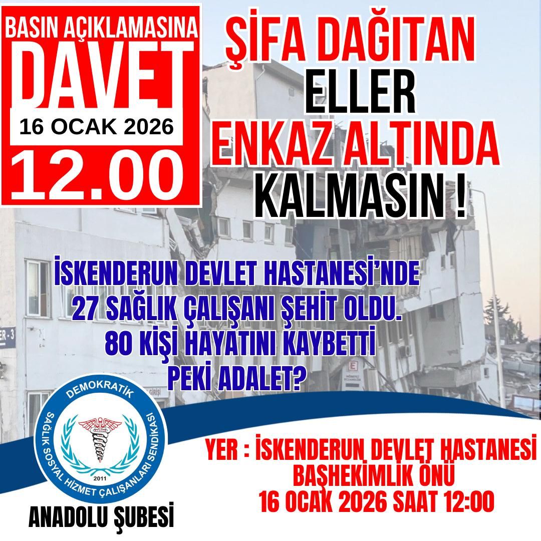 ”Depremde sağlık tesislerinde göçük altında kalan arkadaşlarımızın mücadelesine devam eden tek sendika olarak 16 Ocak Cuma günü saat 12’de İskenderun Devlet Hastanesi, başhekimlik önünde eylem yapacağız. Sizleri de aramızda görmekten şehitlerimiz adına mutluluk duyarız. Hassasiyetiniz çok kıymetli olacaktır.”