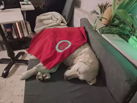 İlçeye bağlı Deniz Mahalle’sinde kahve ürünleri satan bir kafenin çalışanları, akşam saatlerinde iş yerinin önünde yağmur altında üşüyen bir köpek gördü. Kafe çalışanları, bitkin haldeki köpeği içeriye alıp, yiyecek verdi. Köpek, kafenin içinde bulunan koltuk üzerinde yatarak ısındı.