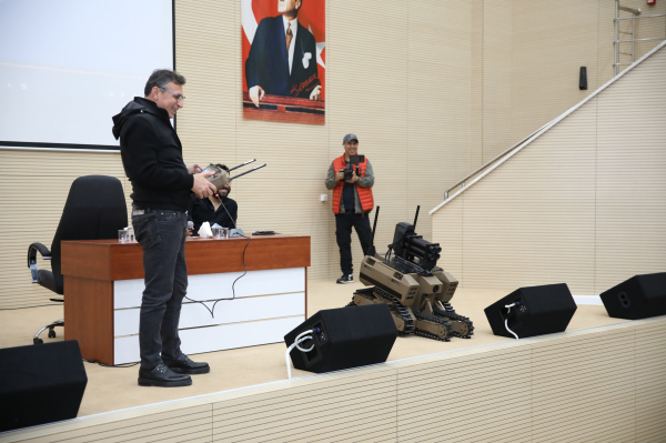 Konferans sonunda öğrencilerle tatlı yiyen Rektör Depci ve Dönmez hatıra fotoğrafları çektirerek sohbet etti. Sohbet sonrasında Dönmezoğlu Bilişim’de yapılan kara aracı ve dronelarla görsel bir şova imza atıldı.