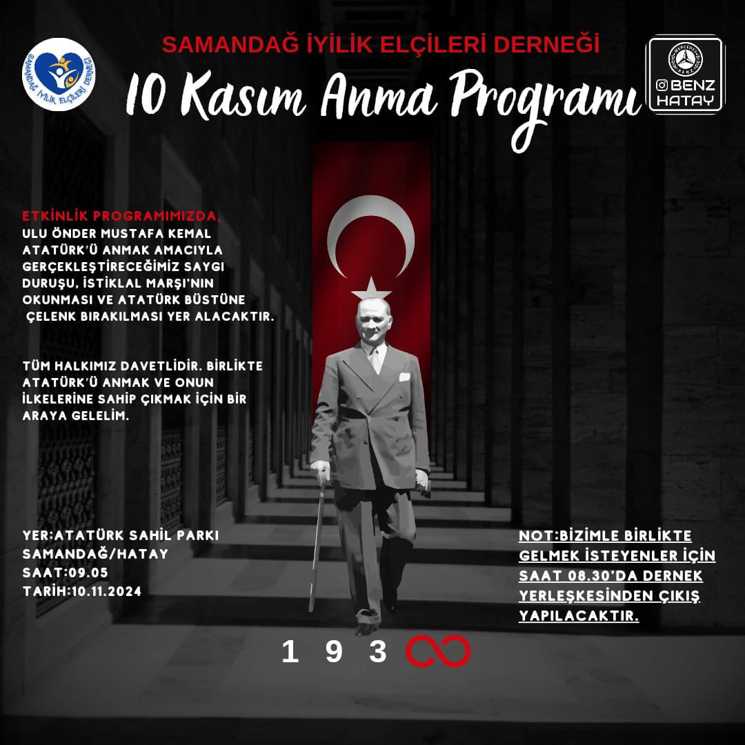 Samandağ İyilik Elçileri Derneği‘nden 10 Kasım Anma Programı Daveti Samandağ İyilik Elçileri Derneği, Türkiye Cumhuriyeti’nin kurucusu Mustafa Kemal Atatürk’ü anmak amacıyla düzenleyeceği 10 Kasım programına tüm halkı davet ediyor.