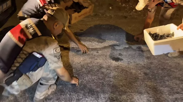 (DHA)- HATAY’ın Samandağ ilçesinde yumurtalarından çıkıp yönünü kaybeden 592 yeşil deniz kaplumbağası (Chelonia mydas) yavrusu, jandarma ekiplerinin tarafından denize ulaştırıldı.