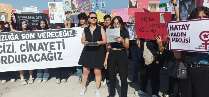 İskenderun Atatürk Anıt alanında ellerinde pankart ve dövizlerle bir araya gelen ‘Kadın Cinayetlerini Durduracağız’ platformu Hatay il sorumlusu Simay Taş, yaptığı açıklamada, Kadına ve çocuğa yönelik suçlardan kaydı olan faillerin, ellerini kollarını sallayarak gezdiğini söyledi.