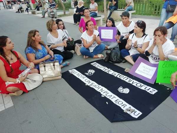 Ölmek istemiyoruz Kadın düşmanı söylem ve politikalar kadınların hayatlarına mal oluyor Boşanmayı Değil Cinayeti Engelle Kadın Cinayetleri politiktir şeklinde sloganlar atan ve nbir süre oturma eylemi yapan kadınlar Bir basın açıklaması yaparak eylemlerine son verdşler