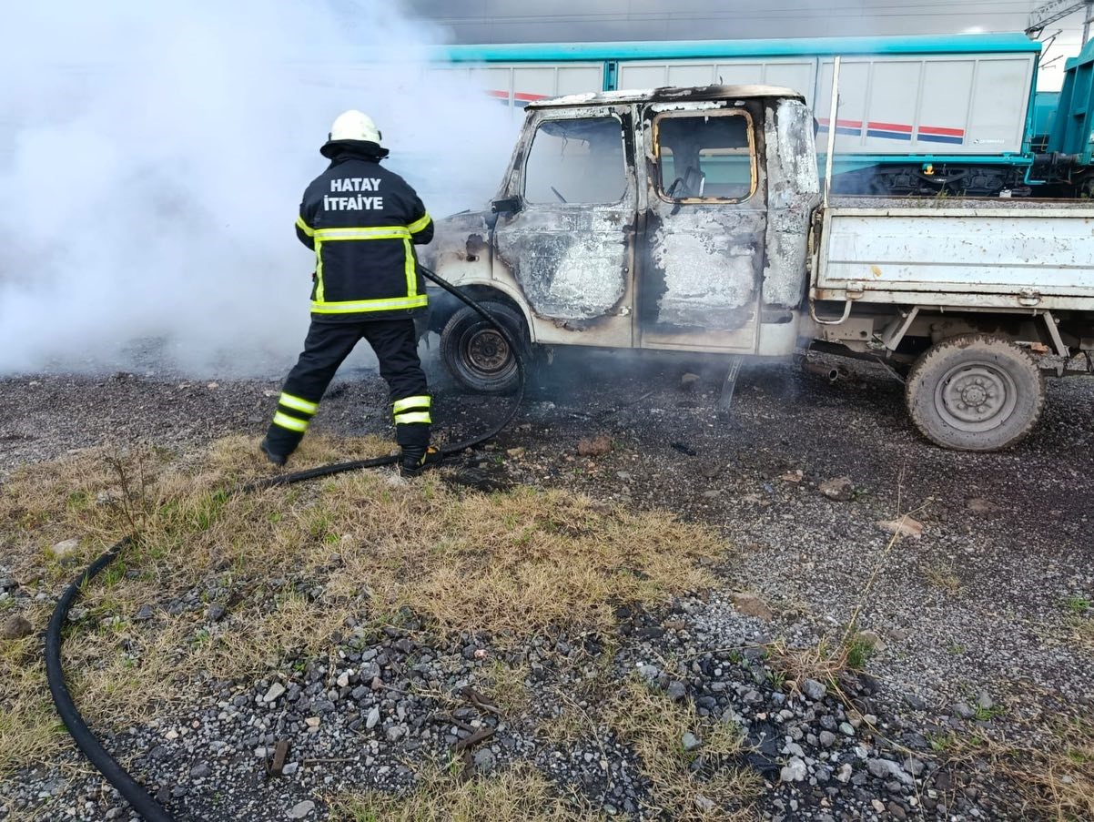 HATAY (İHA) – Hatay’da park halindeyken alevlere teslim olan kamyonet kullanılmaz hale geldi.