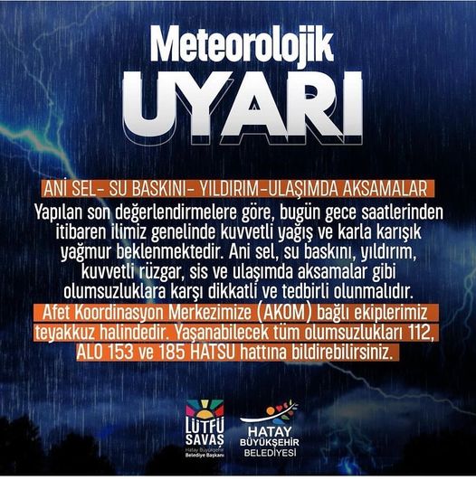 HBB; vatandaşların ani sel ,su baskını ,kuvvetli yağış,fırtına ve ulaşımda yaşayabileceği aksamalara karşı tüm ekiplerin alarmda olacağını;112-153-185 nolu telefonlara bildirimde bulunulabileceğini duyurdu