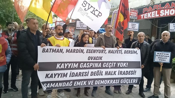 Hatay Samandağ Türkiye İşçi Partisi İlçe örgütü, kayyum atamalarına tepki göstererek, “Asla diz çökmeyeceğiz” vurgusu yapıldı.,