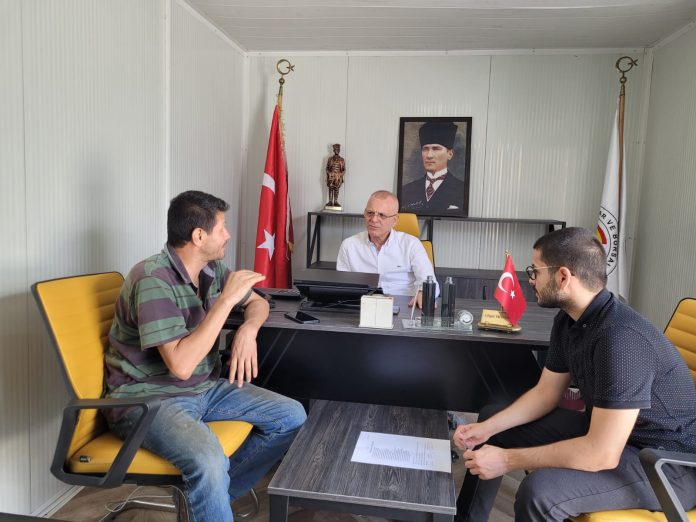 6 Şubat deprem felaketinin ardından binaları hasar alan İskenderun Ticaret Borsası sahilde bulunan Atatürk Anıt Alanında kurdukları konteynerde ilk günden itibaren hizmetlerini aksatmadan sürdürüyor.