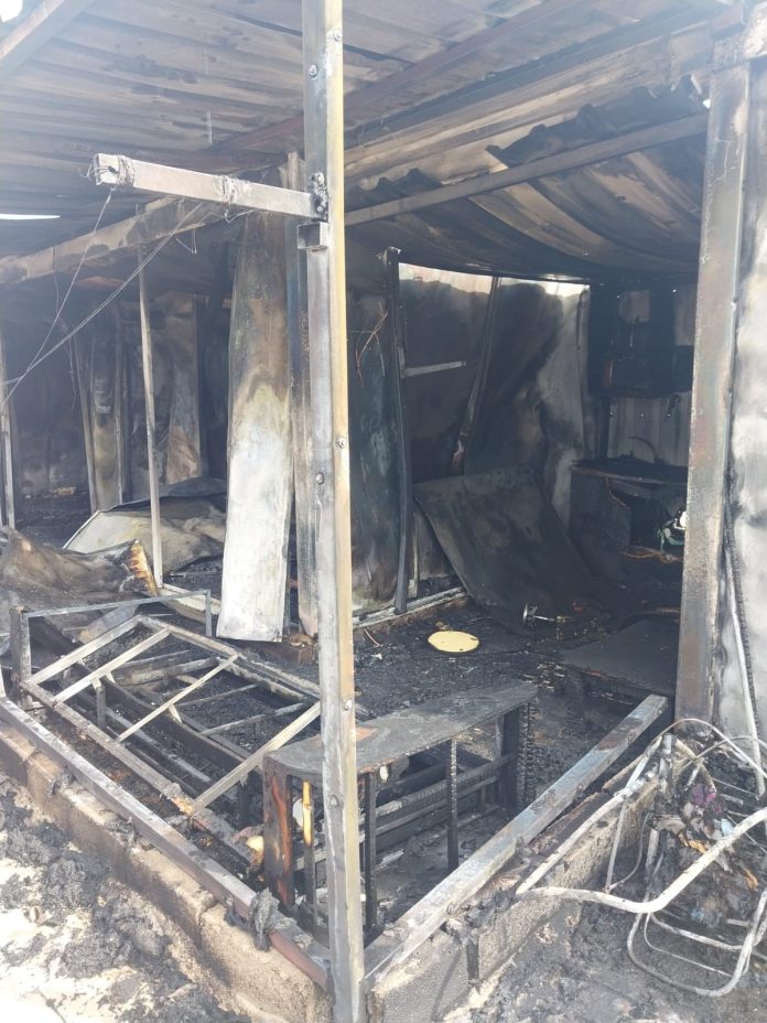 Depremzede ailenin yaşadığı konteyner yanarak kullanılmaz hale geldi.