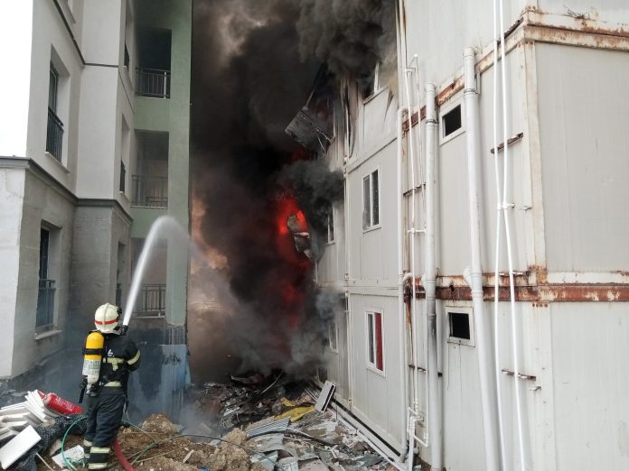 Hatay’da şantiye alanında işçilerin kaldığı konteyner yatakhane alevlere teslim oldu. İtfaiye ekiplerinin alevlere müdahalesi sürüyor.