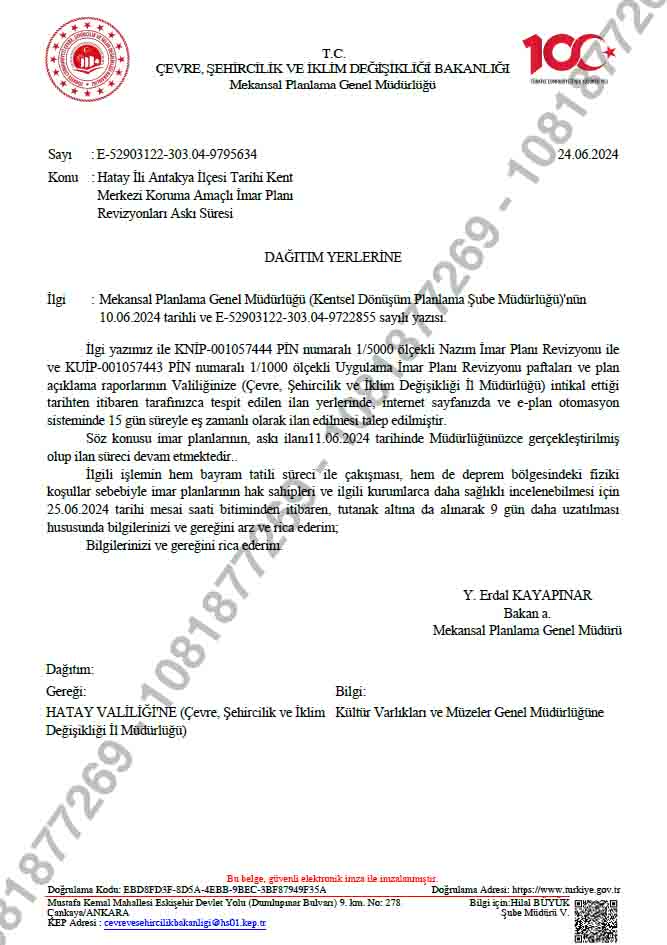 Çevre şehircilik iklim değişikliği bakanı adına Planlama genel müdürü Erdal Kayapınar imzalı 24 Haziran tarihli genelgede, Antakya’da revizyon imar planının askıya çıkması ile birlikte 9 günlük tatilin başladığı ve ilçedeki fiziksel koşulların elvermemesi üzerine askı süresinin 25 Haziran’dan itibaren 9 gün uzatıldığını duyurdu.