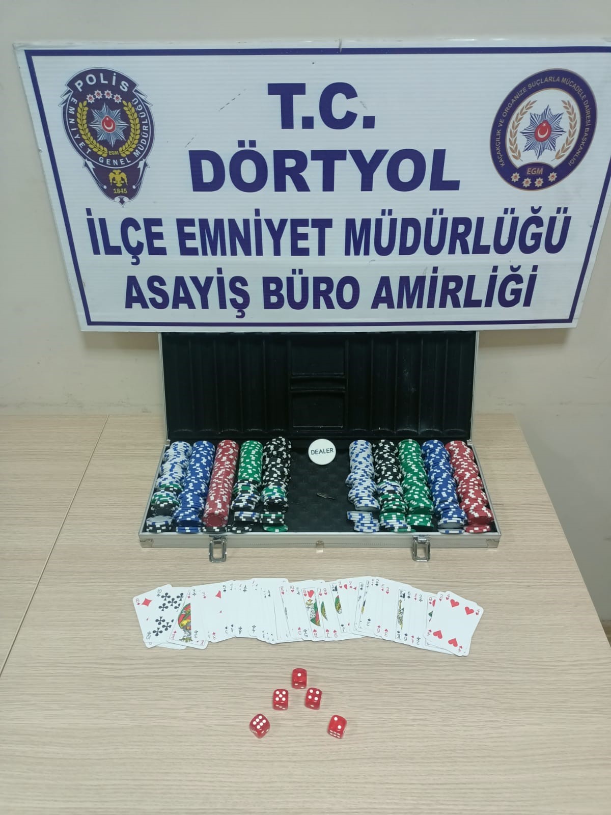 Hatay Emniyet Müdürlüğü, kumar oynanması için yer ve imkan sağlama suçlarına yönelik yapılan çalışmalarını aralıksız sürdürüyor. Çalışmalar kapsamında Dörtyol Ocaklı Mahallesinde bir işyerinde denetim yapıldı. Yapılan denetimde; mekanda sigara içildiği ve masada bulunan şahısların kumar oynadıkları tespit edildi, masada 498 adet poker pulu ve çantası, 5 adet Zar, 52 adet iskambil kağıdı, 1 adet fiyat listesi yazan yazboz defteri olduğu tespit edildi. Kumar oynayan 10 kişiye toplam 64.250 TL idari para cezası uygulanırken, İş yeri sahibi F.K. ile eşi E.K.’ya kumar oynanması için yer ve mekan sağlamaktan adli işlem yapıldı.