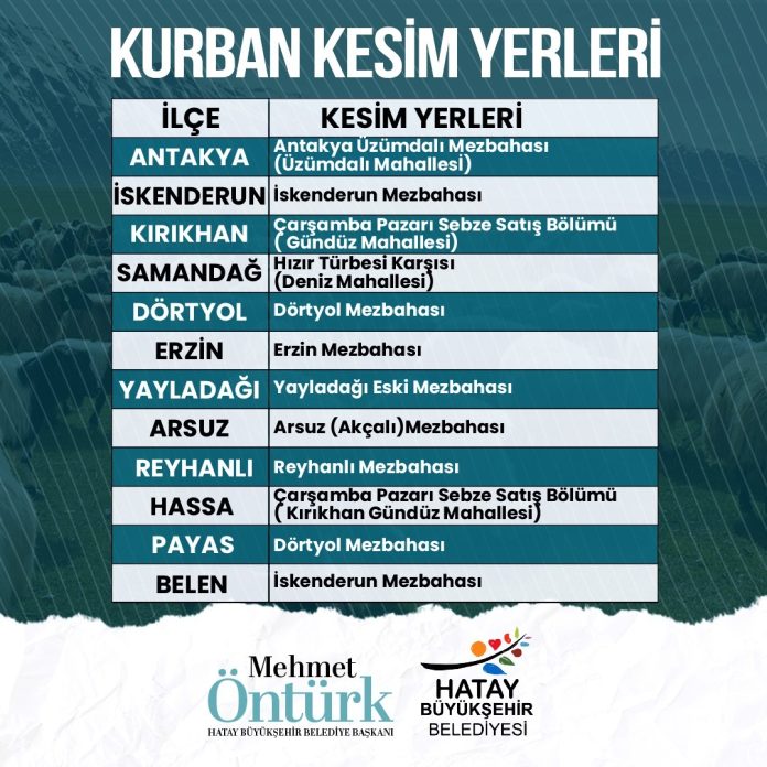 Hatay Büyükşehir Belediyesi Sağlık ve Sosyal Hizmetler Dairesi Başkanlığı Kurban Bayramı öncesinde, “Kurban Kesim Yerleri” ve “Geçici Kurban Satış Yerleri” listesini açıkladı.