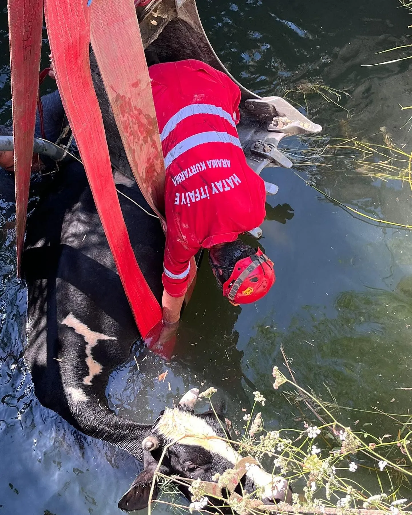 Antakya ilçesine bağlı Dikmece Mahallesi’nde, otlatılan bir inek su kuyusuna düştü. İneğin sahibi, durumu hemen 112 acil çağrı merkezine bildirmesi üzerine olay yerine sevk edilen itfaiye ekipleri, ineğin nasıl çıkarılacağı konusunda inceleme yaptı ve vinç kullanarak kuyuda mahsur kalan ineği kurtarmak için çalışma başlattı.