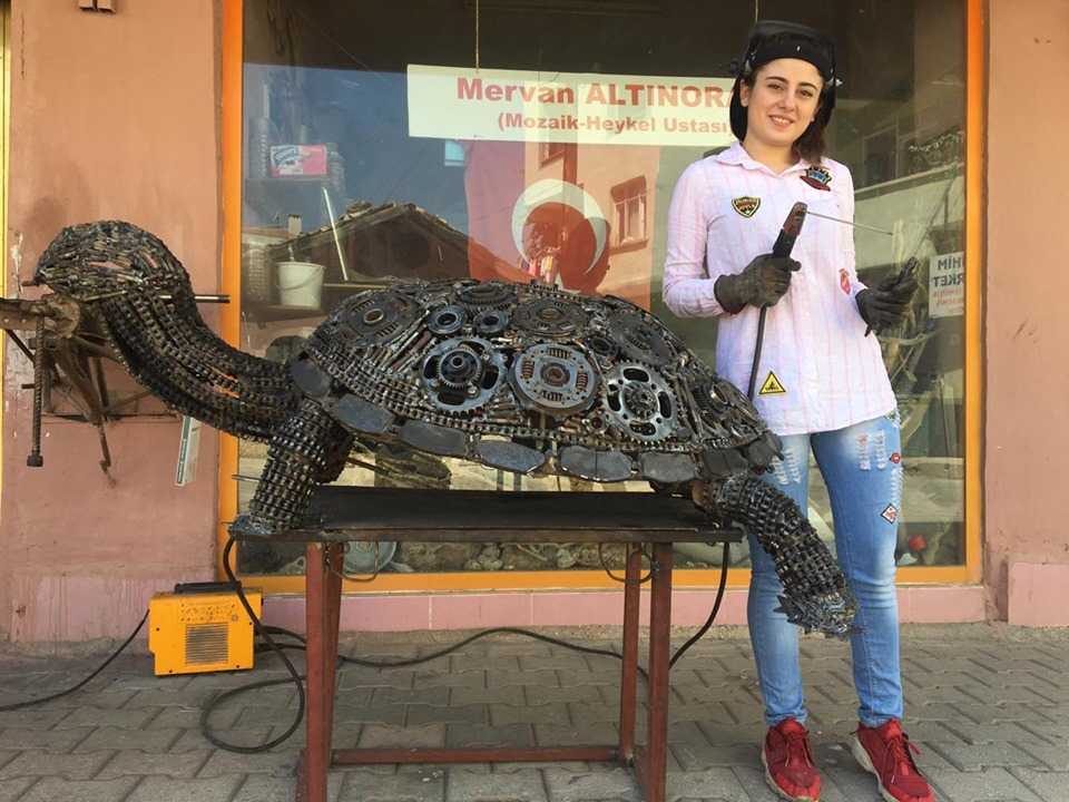 Dilara Altınorak, heykel çalışmalarının bütün aşamalarında kendisinin emeğini geçtiğini ve heykel için kullandığı malzemeler ileri hedefleri için şunları söyledi. Kaplumbağayı yapmak için dişli, zincir, vida, buji ve fren balatası dahil yaklaşık 800 parça hurda kullandığını anlatan Dilara Altınorak, “Babamı örnek aldım. Yaptığı çalışmaları yakından takip ettim. Babam gibi bir sanatçı olmak için kolları sıvadım ve 20 günlük çalışma ile kara kaplumbağası yaptım. Şimdi sırada kartal heykeli var ve daha sonra da hurda malzemeleri ile daha farklı eserler yapacağım” diye konuştu.