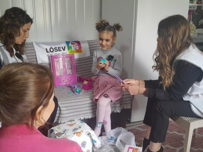 LÖSEV Sosyal Hizmetler Genel koordinatörü Jülide Arifoğlu, LÖSEV Adana İrtibat Ofisi İl Koordinatörü Betül Özgüven ve LÖSEV Sosyal Hizmet Sorumlusu Deniz Bayraktar Çoban, Hatay’da ikamet eden Sökmen ve Ördek ailelerini ziyaret etti. Heyetin ilk durağı deprem felaketinin ardından kendisine ALL teşhisi konulan Kumsal Ördek’in ailesi oldu. Konteyner kentte yaşayan aileyi ikametlerinde ziyaret eden heyet, Kumsal Ördek’e(3) hediyelerini takdim etti. Ardından ise annesi Seren Ördek’e 100 Bin TL’lik yardım çekini hediye ettiler. Aile ile bir süre sohbet eden LÖSEV heyeti, her zaman lösemili çocukların yanında olacaklarını belirttiler.