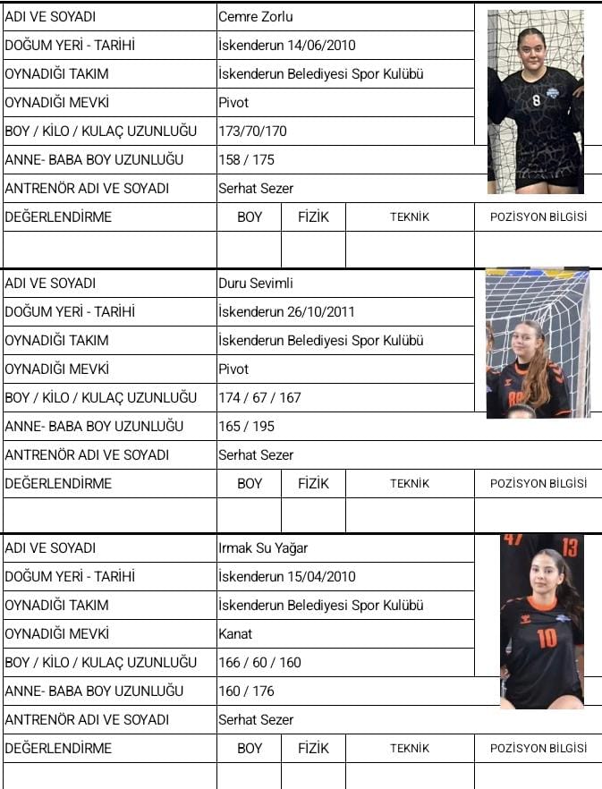 Geçen yıllarda çeşitli kategorilerde milli takıma oyuncu kazandıran İskenderun Belediyesi hentbol takımının genç oyuncuları taramalara davet edildi.2010 doğumlu Cemre Zorlu(pivot),2011 doğumlu Duru Sevimli(pivot) ile 2010 doğumlu Irmak Su Yağar(Kanat) milli olma yolunda ilk adımı atacak.Türkiye Hentbol federasyonu tarafından davet edilen oyuncular 24-26 Şubat 2026 tarihleri arasında Adana’da yapılacak U-15 milli takım taramasına katılacak