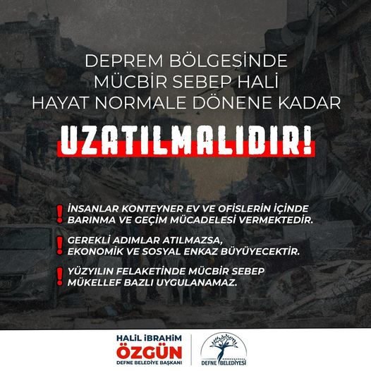 Defne Belediye Başkanı Halil İbrahim Özgün, deprem bölgesinde yaşanan zorluklar ve hükümetin mücbir sebep uygulamasına dair önemli açıklamalarda bulundu.