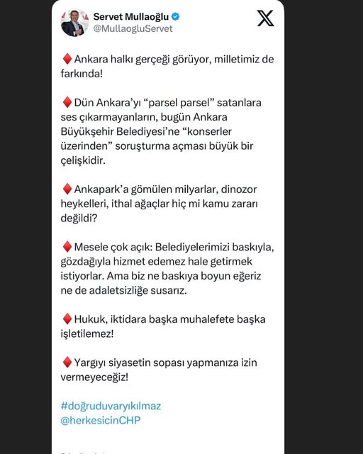 CHP Hatay Milletvekili Servet Mullaoğlu, Ankara Büyükşehir Belediyesi’ne yönelik başlatılan soruşturmayı eleştirerek, “Dün Ankara’yı parsel parsel satanlara sessiz kalanların bugün konserler üzerinden soruşturma açması büyük bir çelişkidir” dedi.