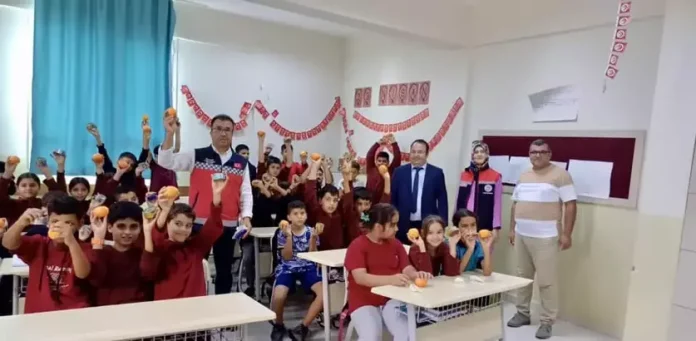 Antakya ilçesine bağlı Aşağıoba İlkokulu’nda Hatay Tarım Orman Müdürlüğü ekipleri tarafından güvenli gıda dersi verilerek konserve balık ve mandalina dağıtımı yapıldı.