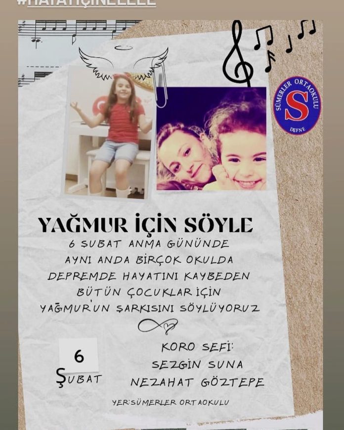 6 Şubat’taki depremde hayatını kaybet Hatay’ın Defne ilçesinde, 7. sınıf öğrencisi Yağmur Rifaioğlu’nun yazdığı çocuk şarkısı sözleri öğretmenleri tarafından bestelendi.