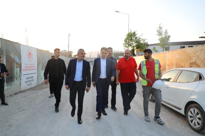 Tarihi Uzun Çarşı’da yıkılan işyerlerinin yerine yapılan inşaat çalışmalarında da incelemelerde bulunan Öntürk, Kurtuluş Caddesi ve Habib-i Neccar Cami’sinin restorasyon süreci ile ilgilide bilgiler aldı.