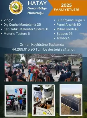 Hatay Orman Bölge Müdürlüğü tarafından yürütülen çalışmalar kapsamında süt koyunculuğu alanında 6 haneye destek sağlandı. Fenni arıcılık faaliyetleri için 80 hane destek kapsamına alınırken, kırsal ekonomiyi canlandırmayı hedefleyen mikrokredi uygulamalarıyla 40 haneye finansman imkanı sunuldu. Enerji maliyetlerini düşürmek ve çevre dostu uygulamaları yaygınlaştırmak amacıyla Şebekeye Bağlı Çatı Tipi Güneş Enerjisi Sistemi (ŞEBGES) kurulumları kapsamında 96 haneye destek verildi.