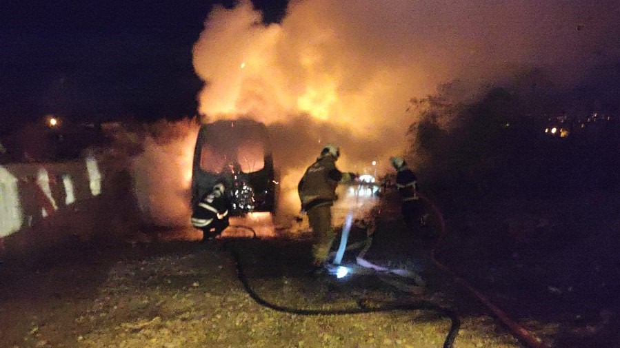 HATAY’DA PARK HALİNDEYKEN ALEVLERE TESLİM OLAN MİNİBÜS YANARAK KULLANILMAZ HALE GELDİ. (ESMA KURAL/HATAY-İHA)
