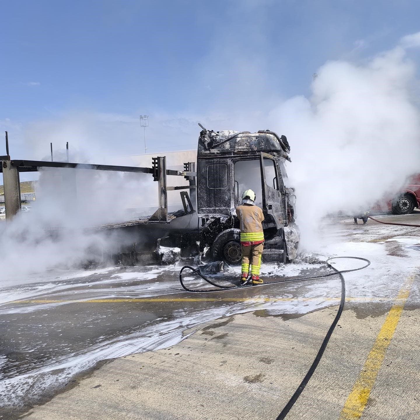 Hatay’ın Reyhanlı ilçesinde Cilvegözü Sınır Kapısı’nda park halindeki tır, yanarak alev topuna döndü. Alevlere teslim olan tır, kullanılmaz hale geldi.