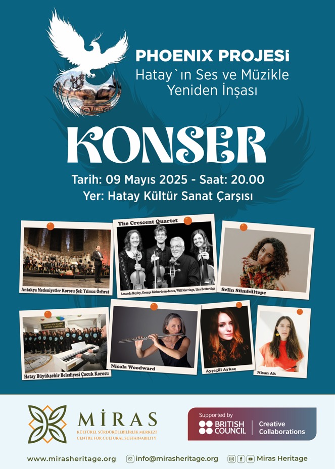 British Council’ın 2024-2025 Yaratıcı İşbirlikleri Hibe Programı tarafından desteklenen Phoenix Projesi: Hatay’ın Ses ve Müzikle Yeniden İnşası, MİRAS Direktörü ve Zhaoqing Üniversitesi Öğretim Üyesi Olcay Muslu ile MİRAS Uluslararası Danışma Kurulu Başkanı Zhaoqing Üniversitesi Uluslararası Kültürel Sürdürülebilirlik Merkezi Başkanı Prof. Dr. Huib Schippers’ın liderliğinde hayata geçiriliyor. Projede ayrıca Royal College of Music’ten Mary Stakelum ve Bath Spa Üniversitesi’nden Amanda Bayley gibi saygın sanat ve akademi temsilcileri de yer alıyor.