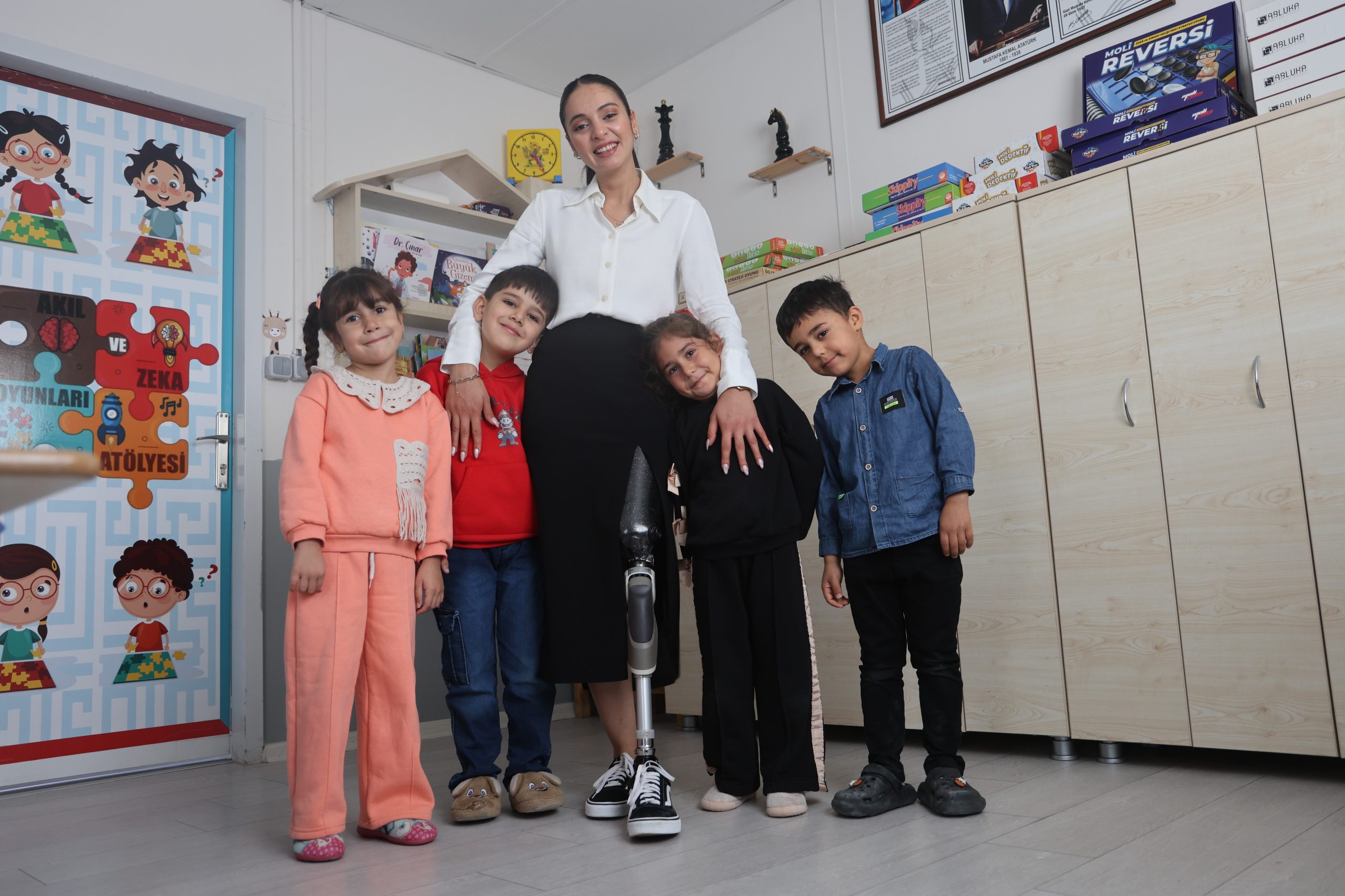 Enkazdan 46.saatte çıkarıldığını ve aynı enkazda babasının vefat ettiğini söyleyen öğretmen Sena Alkan, hayattaki olumsuzluklara rağmen öğretmenlikten vazgeçmediğini belirterek, “Deprem zamanında Hatay’daydım. Ailemle birlikte yaşıyordum. Ücretli öğretmenlik yapıyordum ve aynı zamanda sınava hazırlanıyordum. Deprem anında evimiz yıkıldı ve enkazdan 46 saat sonra çıkarıldım. Depremde babamı kaybettim, annem ve erkek kardeşimle sağ kurtulduk. Böbreklerimin çalışmadığını ve bu yüzden bacağımın ampute olacağını söylediler. Hatay’dan Ankara’ya bir hastaneye gittik. Hastanede ameliyatla bacağımı dizüstünden ampute ettiler. Fizik tedavi için İstanbul’a gittim. Devletin verdiği protez hakkı ile İstanbul’da bir klinikte protezimi taktılar. Bu süreçle birlikte tedavilerim devam etti. İstanbul’dan şubat ayında Hatay’a geldim ve ücretli öğretmenliğe devam ettim. Nisan ayında atamam yapıldı, eylül ayında göreve başladım ve iki aydır bu okulda anaokulu öğretmenliği yapıyorum” dedi.