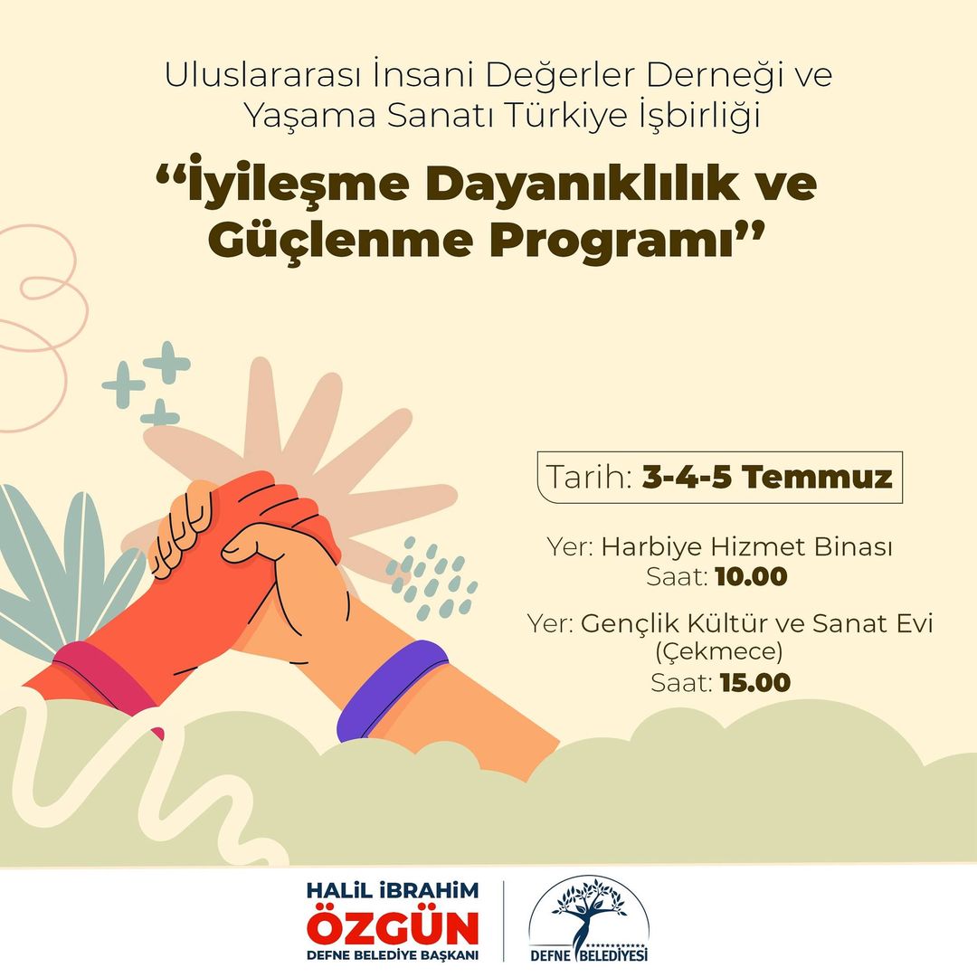 Defne Belediyesi, Uluslararası İnsani Değerler Derneği ve Yaşama Sanatı Türkiye iş birliğiyle sinir sistemini yatıştırmayı ve günlük yaşam için rahatlama tekniklerini öğretmeyi amaçlayan “İyileşme, Dayanıklılık ve Güçlenme Programı” düzenliyor.