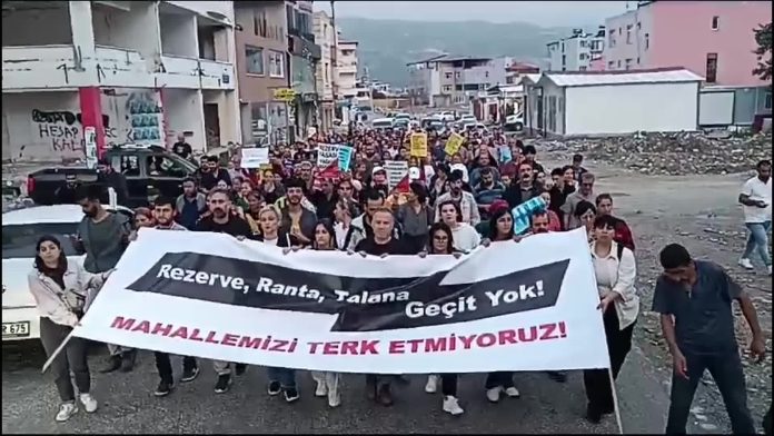 Hatay’da merkez ilçe Defne, Samandağ ve Kırıkhan merkezlerinin bir çok mahallesinde rezerv alan ilan edildi. Rezerv alanda evlerinin ellerinden alınmasına karşı çıkan yurttaşlar dün Samandağ’da yürüdü. “Susma sustukça sıra sana gelecek”, “Bu memleket bizim sermaye defol” sloganları atan vatandaşlar, “Mahallemizi terk etmiyoruz, rezerve ranta, talana geçit yok” pankartı taşıdı.