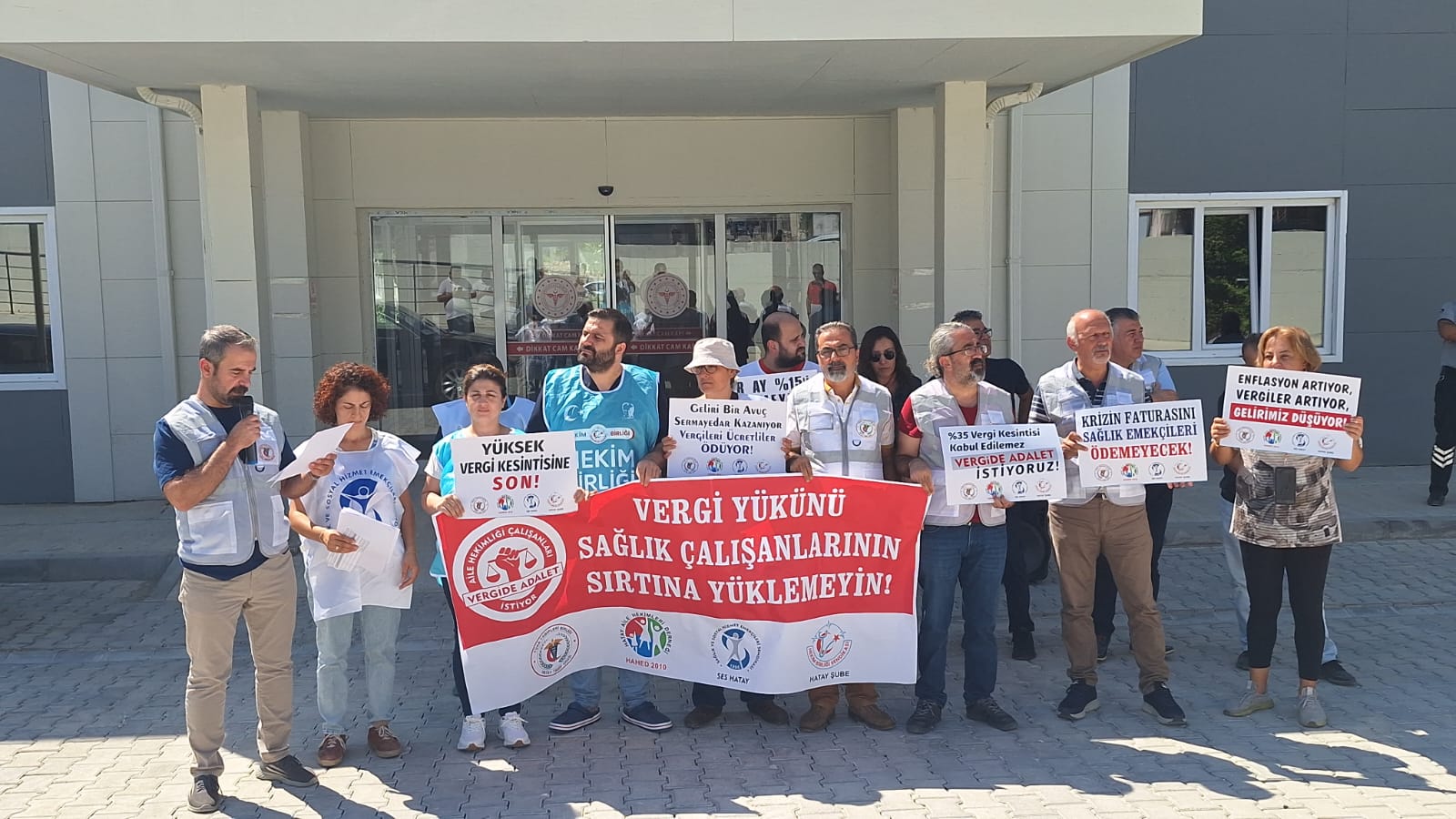 Sağlık ve Sosyal Hizmet Emekçileri Sendikası (SES) ile ğiTürk Tabipleri Birli Aile Hekimliği Kolu’nun (TTB AHEK) öncülük ettiği, illerde sağlık emek-meslek örgütlerinin de katıldığı “Sağlık Çalışanları Vergide Adalet İstiyor” başlıklı eylemler, 29. haftasında devam etti. Hatay il sağlık Müdürlüğü önünde yapılan basın açıklamalarında “Vergide Adalet” çağrılı pankartlar ve dövizler taşındı.