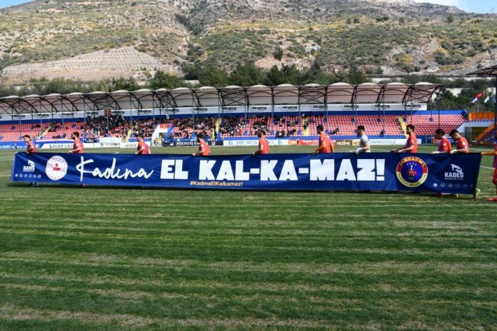 HATAY (İHA) –  İskenderun ilçesinde oynanan İskenderunspor – Isparta 32 Spor müsabakasında futbolcular, yeşil sahada açtıkları pankartla ‘Kadına el kalkamaz’ mesajı verdiler.
