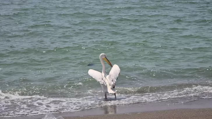 Avrupa’nın güneydoğusundan Asya’ya yayılan bölgede ve Afrika’da bataklıklarda ve sığ göllerde yaşayan ak pelikanın tek başına sahilde beslenmesi dikkat çekti. Bölgede nadir görülen ak pelikanın, göç yolunda, içinde bulunduğu sürüden ayrılmış olabileceği belirtildi. Sahilde yürüyüş yapanlar da pelikanı rahatsız etmemek için özen gösterdi. (D