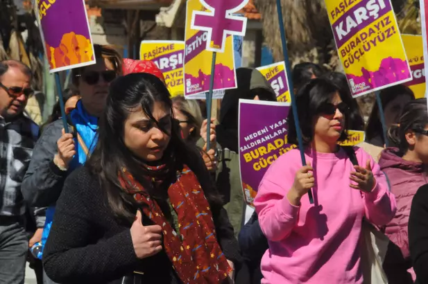 8 Mart Dünya Kadınlar Günü nedeniyle ilçedeki çeşitli sivil toplum kuruluşlarının çağrısıyla toplanan kadınlar, Atatürk Parkı’nda buluştu. Ellerindeki pankart ve dövizlerle çeşitli sloganlar atan kadınlar, Hızır Parkı’na yürüdü. Polis ekiplerinin güvenlik önlemleri aldığı alana gelen kadınlar, müzik eşliğinde halay çekti.