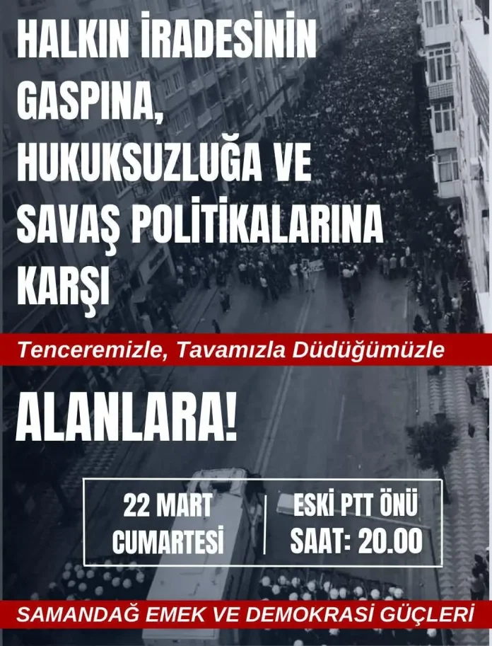Samandağ Emek ve Demokrasi Güçleri tarafından organize edilen eylem, 22 Mart Cumartesi günü saat 20.00’de Eski PTT önünde gerçekleşecek.