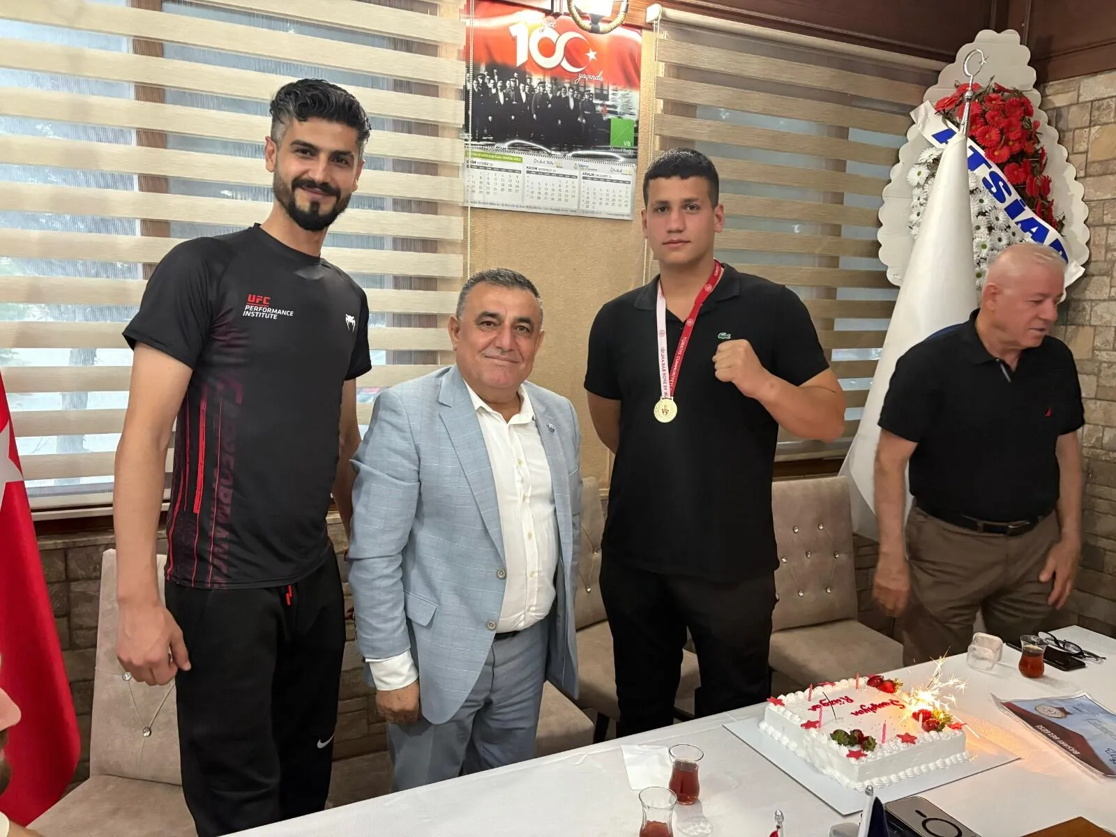 Arsuz Altın Yumruk Spor Kulübü sporcusu olan Rüzgar Geçer, antrenörü Ali Antakyalıoğlu ve derneğin üyesi Berkan Kirar ile birlikte Arsuz İş İnsanları Derneği’ni ziyaret etti.