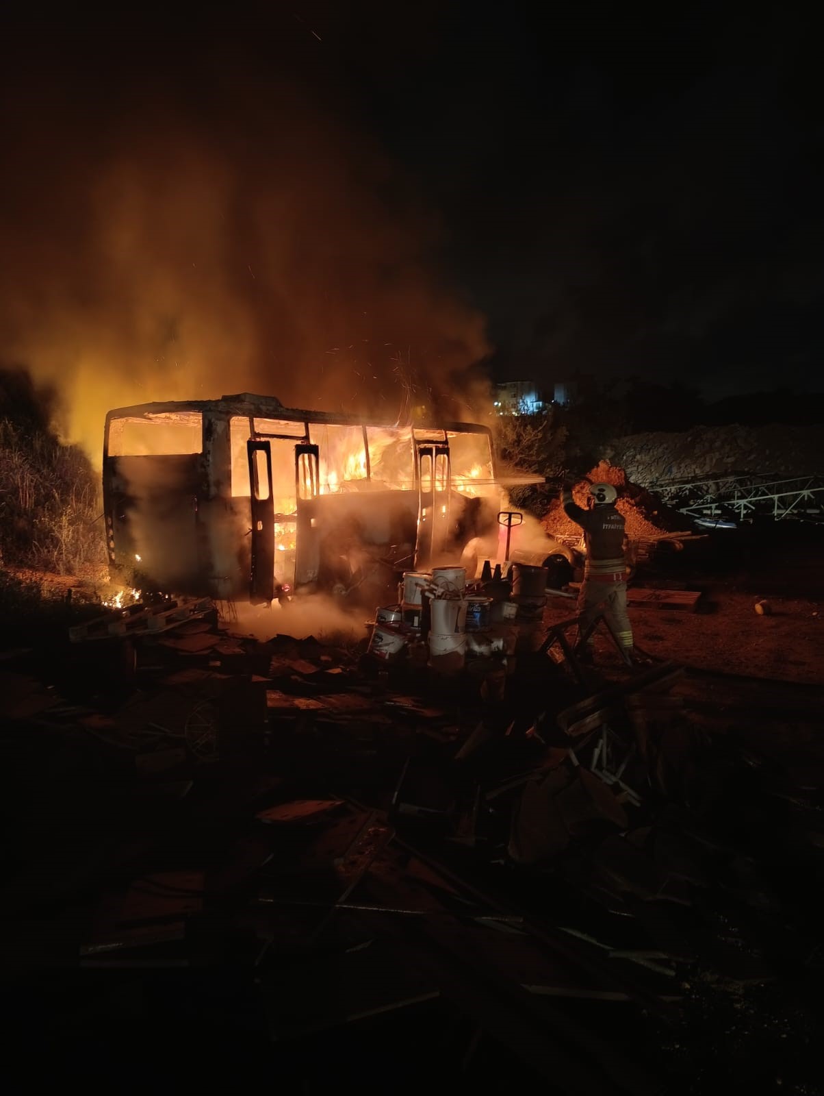 HATAY’DA ŞANTİYE ALANINDA ALEVLERE TESLİM OLAN KONTEYNER VE MİNİBÜS YANARAK KULLANILMAZ HALE GELDİ. (SELAHATTİN ÇETİN/HATAY-İHA)