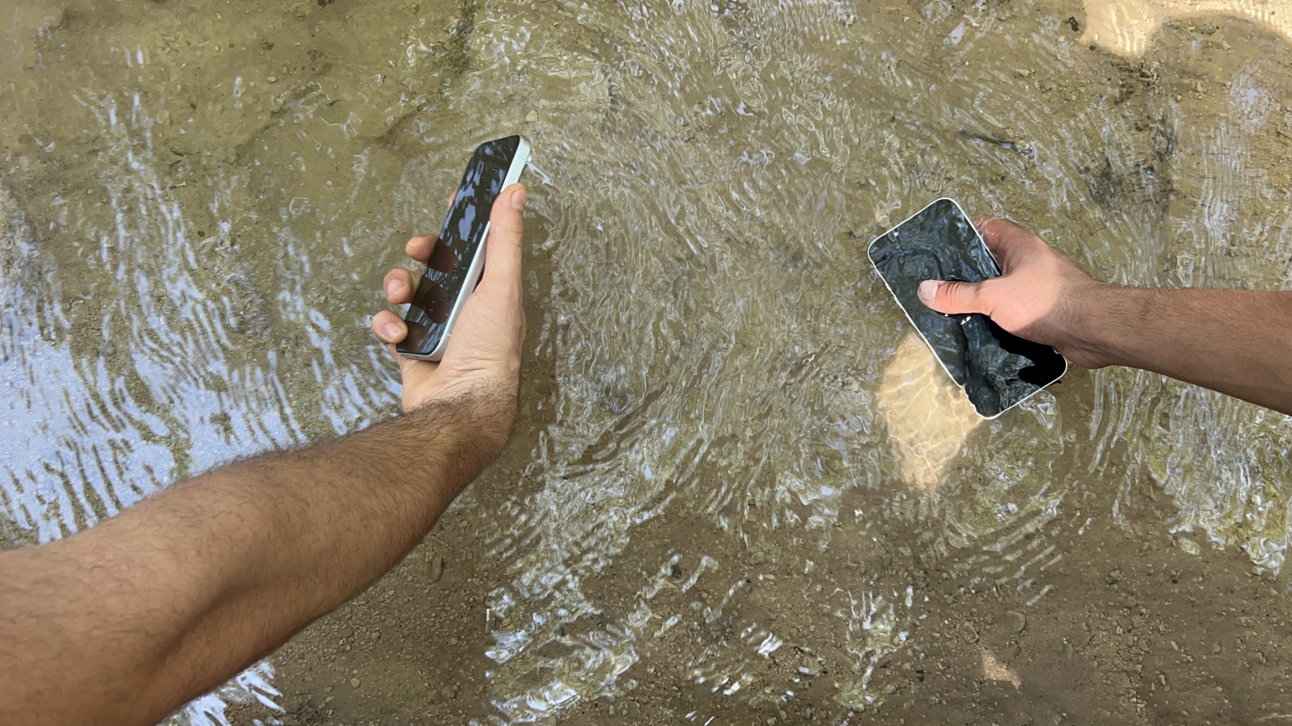 İskenderun ilçesi Suçıkağı Mahallesi’nde hava sıcaklığı 45 dereceye kadar yükselince, cep telefonları da aşırı ısındı. Sıcakta çalışmakta güçlük çeken telefonlarını çalıştırmak isteyen iki çalışan, ilginç bir yönteme başvurdu. İki arkadaş, telefonlarını akarsuya sokarak serinlettiler ve kullanmaya devam ettiler.