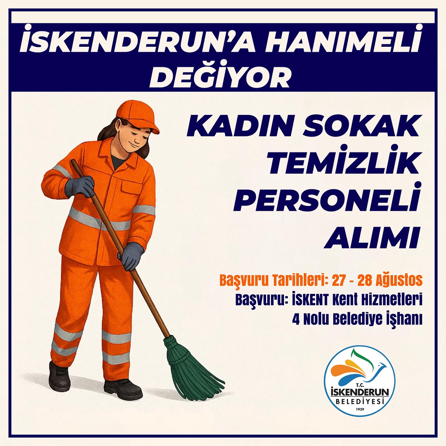 İlçe temizliğine büyük önem veren Başkan Dönmez, ‘İskenderun’a Hanımeli Değiyor!’ sloganıyla yapılacak olan kadın sokak temizlik personeli alımı ile ilgili yaptığı açıklamada, “ Şehrimizin kalkınmasında ve yeniden toparlanmasında en büyük gücümüz olan kadınlarımız, şimdi de temizlik hizmetlerinde görev alacak. İskenderun’un sokakları artık kadın emeği ve titizliğiyle daha temiz, daha düzenli olacak. Özellikle kadınlarımızdan oluşacak yeni sokak süpürge ekibimiz için başvurular başladı! Başvuru Tarihleri: 27 – 28 Ağustos, Başvuru: İSKENT Kent Hizmetleri – 4 Nolu Belediye İşhanı” dedi.