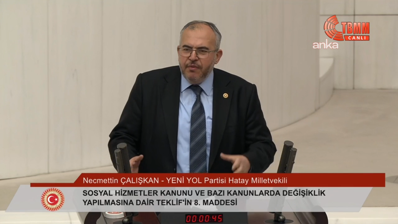 Yeni Yol Grubu Hatay Milletvekili Necmettin Çalışkan, TBMM Genel Kurulu’nda yaptığı konuşmada aile yasası ve sosyal medya düzenlemelerini eleştirdi. Düzenlemeyi “yasakçı zihniyetin ürünü” olarak nitelendiren Çalışkan, “İktidar gerçekten çocukların sosyal medyadaki kötü, müstehcen yayınlardan, oyunlardan uzak durmasını istiyorsa çok kolay bir tedbir var. Hemen bir teklif getirin A Haber kapatılsın, ,., sabah kuşağı programların yasaklansın rahatça çözülür ama bunlar gündemde yok” ifadelerini kullandı.